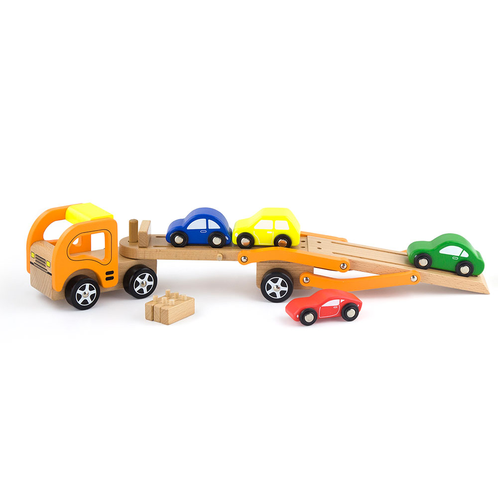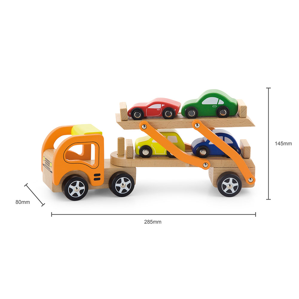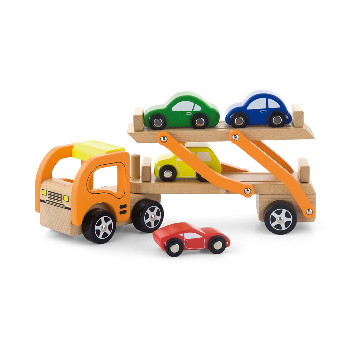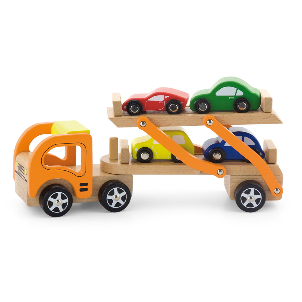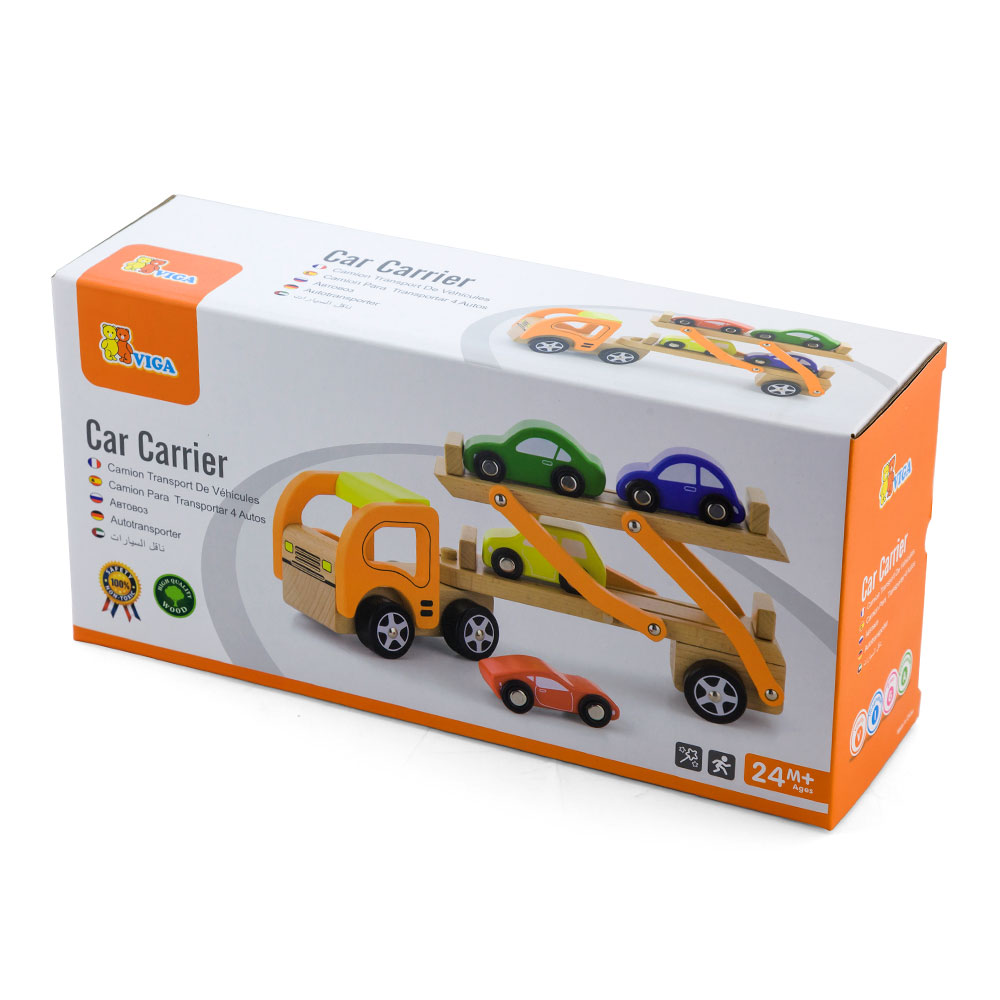 Ξύλινο φορτηγό μεταφοράς αυτοκινήτων από την εταιρεία Viga. Περιλαμβάνει καμπίνα, διπλό ρυμουλκούμενο και 4 αυτοκίνητα σε διαφορετικά χρώματα και μοναδικά σχέδια. Φορτώστε τα αγαπημένα σας αυτοκίνητα κι ετοιμαστείτε για ατελείωτες ώρες παιχνιδιού. Το τρέιλερ στρέφεται προς τα κάτω για να δημιουργήσει μια ράμπα για τη φόρτωση και εκφόρτωση των αυτοκινήτων. Κατάλληλο για παιδιά ηλικίας 2 ετών και άνω. Διαστάσεις 28,5×14,5×8 εκ.